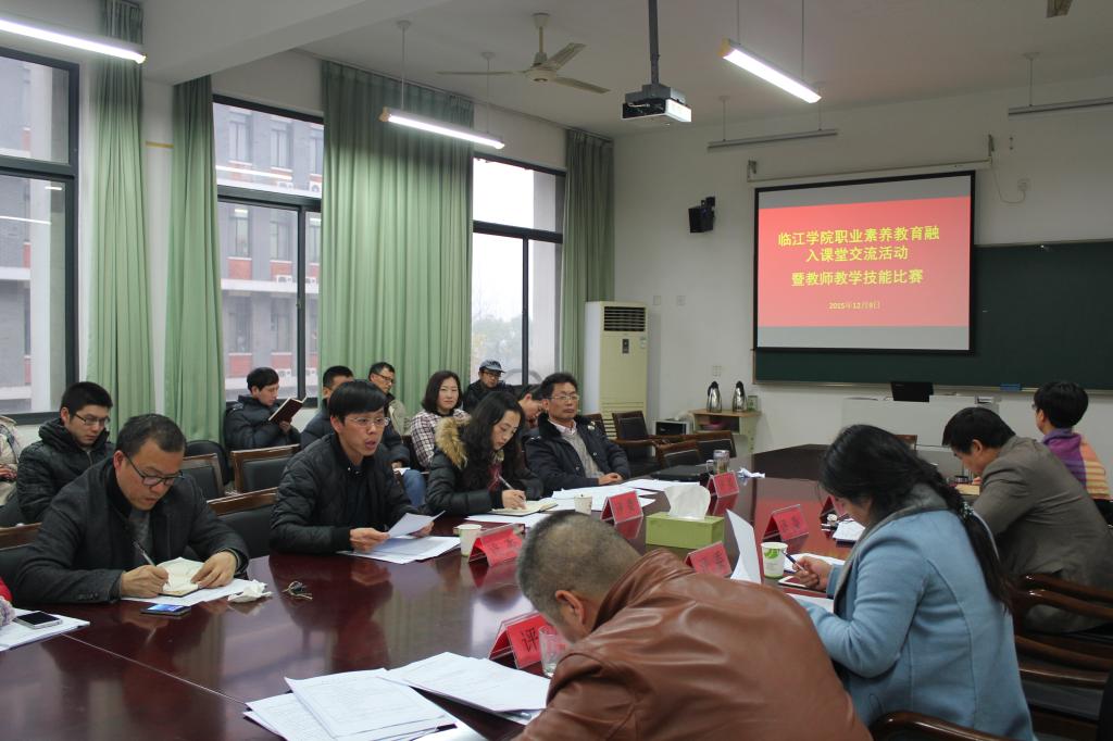 12月9日下午14:00,临江学院在6238会议室举行职业素养教育融入课堂交流活动暨教师教学技能比赛,临江学院全体教职工到场观摩。本次交流活动(比赛)评委由临江学院谢萍华院长、周佳良副书记、何艺副院长、专业负责人和教科办俞卫阳担任,并邀请专业建设指导处童国通副处长到场指导并担任评委。精细专业丁晓民老师、制药专业张惠燕老师、园艺专业魏春海老师、食品专业唐平老师、环境专业何连军老师参加交流比赛。