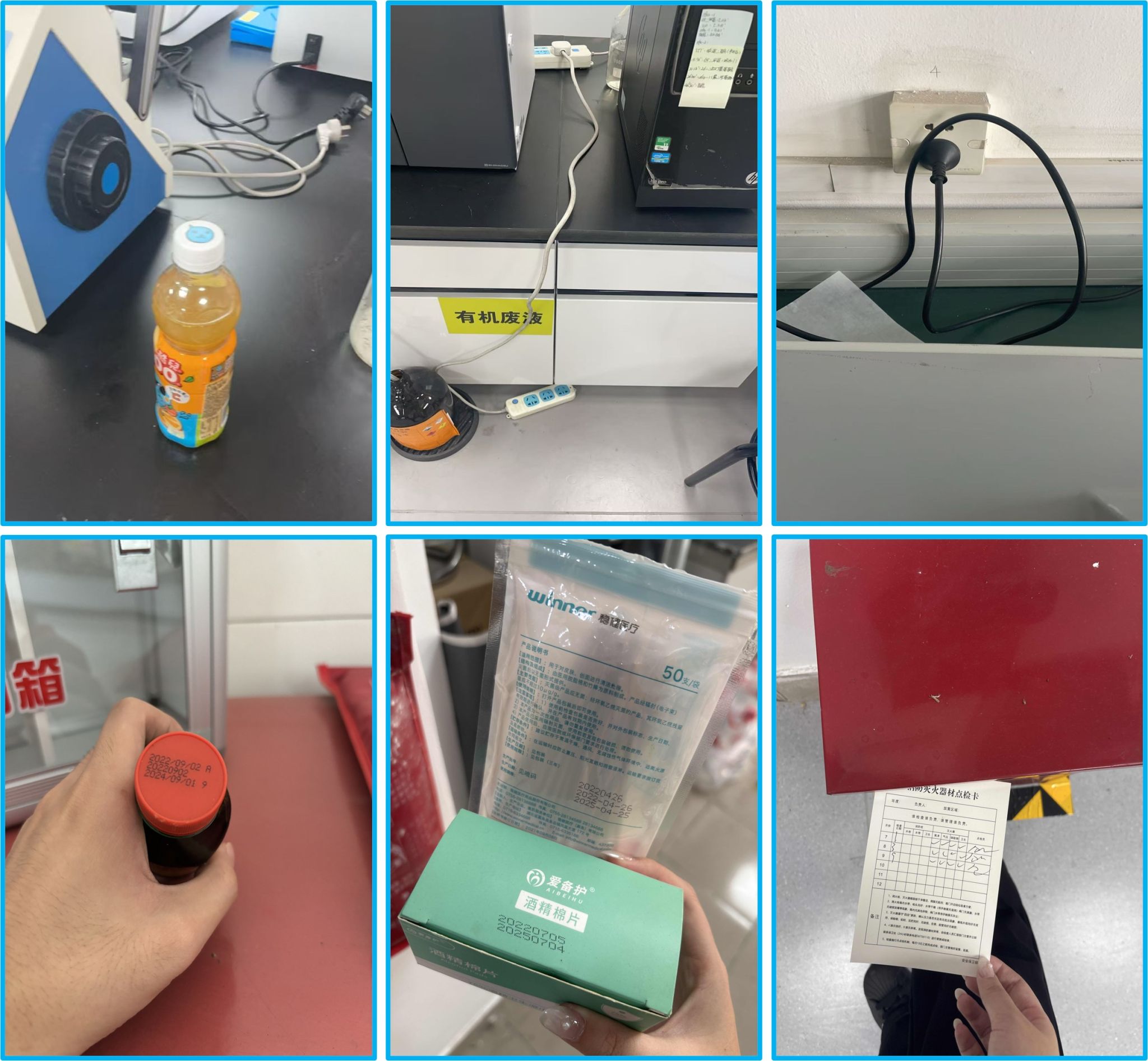 3、实验物品管理不规范:A516实训室内,饮料被随意放置在实验台上,且未张贴任何“禁止饮用”的明显标识。